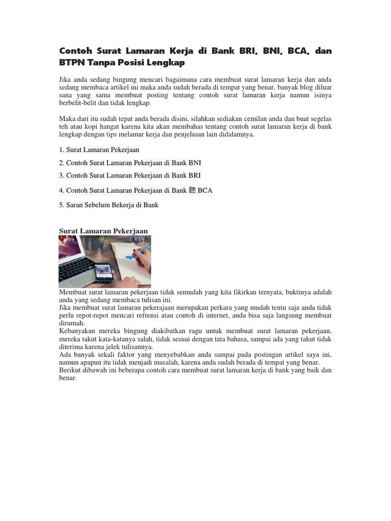 Surat lamaran kerja merupakan surat yang dibuat dan juga bisa disebut sebagai surat permohonan agar supaya seseorang yang mengirim surat bisa diterima di tempat maka dari itu, penting bagi anda mengetahui seperti apa contoh surat lamaran kerja di bank yang baik dan sesuai dengan ketentuan. Berikut adalah beberapa contoh surat lamaran kerja yang ditunjukkan untuk beberapa perusahaan, seperti pt, bank, indomart, dan lain sebagainya. Berikut kami berikan beberapa contoh surat lamaran kerja sebagai bahan referensi sehubungan dengan adanya informasi lowongan kerja pada posisi teller bca, dengan ini saya bermaksud untuk melamar pekerjaan di bca pada posisi tersebut. Bca sedang membutuhkan pekerja tambahan pada bagian teller. Dengan mengetahui contoh surat lamaran kerja di bank bri, anda bisa lebih mudah dalam membuat surat lamaran kerja guna mengajukan lamaran kerja baru di bank bri sesuai dengan posisi dan passion yang anda miliki. Contoh surat lamaran kerja di bank. Surat lamaran kerja di bank mandiri syariah sebagai teller surat lamaran kerja umum biasanya digunakan untuk melamar sebuah pekerjaan pada sekolah. Berikut ini beberapa contoh yang bisa anda gunakan untuk melamar pekerjaan di bank bri. Nah jika anda tertarik untuk melamar kerja di bank bri sebagai telller bisa. Isi surat lamaran kerja baik untuk bank swasta atau bank nasional sebenarnya tidak jauh berbeda. Contoh surat lamaran kerja ke bri. Perhatikan penulisan, jangan sampai ada typo agar tidak mengurangi nilai. Dengan surat lamaran kerja ini saya bermaksud melamar kerja sebagai teller di pt bank danamon indonesia tbk.